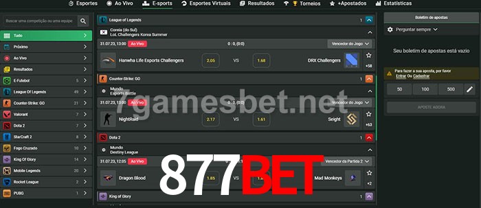 O 877bet oferece uma grande seleção de opções de apostas em e-sports com probabilidades competitivas